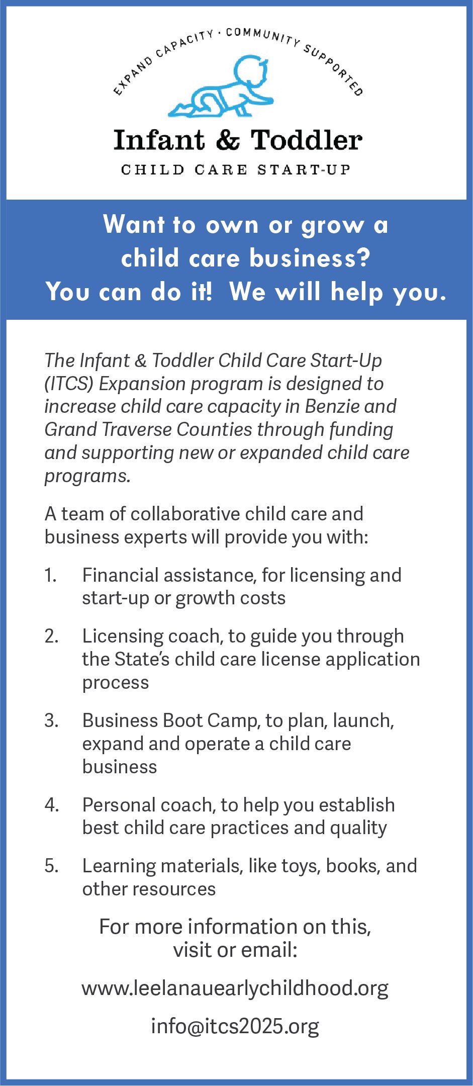 Made possible by a $400,000 grant between the Michigan Department of Labor and Economic Opportunity and the Leelanau Early Childhood Development Commission, the Infant & Toddler Child Care Start-Up Expansion program, or ITCS, is providing financial and coaching support to providers and helping with start-up or expansion expenses, training, a business boot camp and other areas.